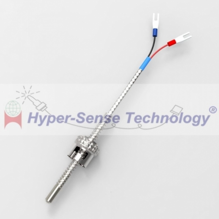 | ² Thermocouple: K-type, ±1.5℃ or 0.004∣t∣℃, Class 1 ² Coating: Ceramic glue ² Probe: Stainless steel pipe ² Insulation: Glass fiber braid ² Outer Braid: Stainless steel ² Bayonet: Stainless steel cap ² Connector: Y-shaped crimp terminal l Max Temperature: 400℃ l Application: Plastics processing machinery, Engine cylinder heads, Pipelines and vessels |